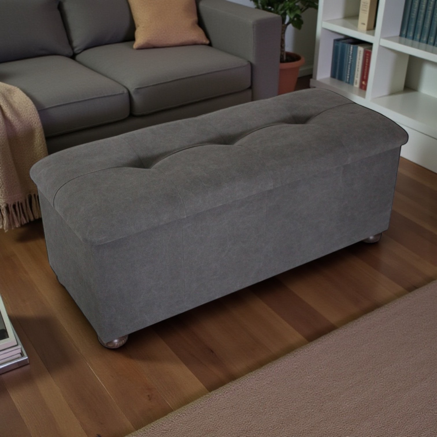 Minkštasuolis tekintomis medinėmis kojelėmis su daiktadėže. Tinka kompl0ektuoti kartu su lova EIRA.